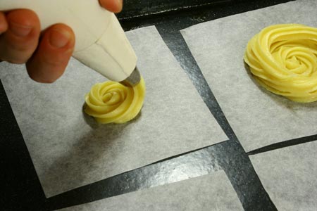 Versare in una pentola l’acqua con il burro e il pizzico di sale, accendete il fuoco a fiamma media, quando l’acqua comincerà a fare le prima bollicine, ma non a bollire, versatevi la farina setacciata tutta insieme e mescolare energicamente per 10 minuti con la frusta fino a quando il composto non si staccherà dai bordi della pentola. Spegnere il fuoco e aggiungere le 6 uova, uno alla volta sempre girando con forza ed eventualmente con una frusta elettrica finchè si sarà amalgamato tutto il composto. Lasciar riposare per 20-25 minuti.