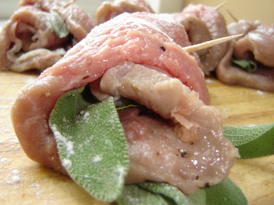 Lavare ed asciugare le foglie di salvia. Disporre su ciascuna fettina di vitello una fetta di prosciutto e una foglia di salvia.